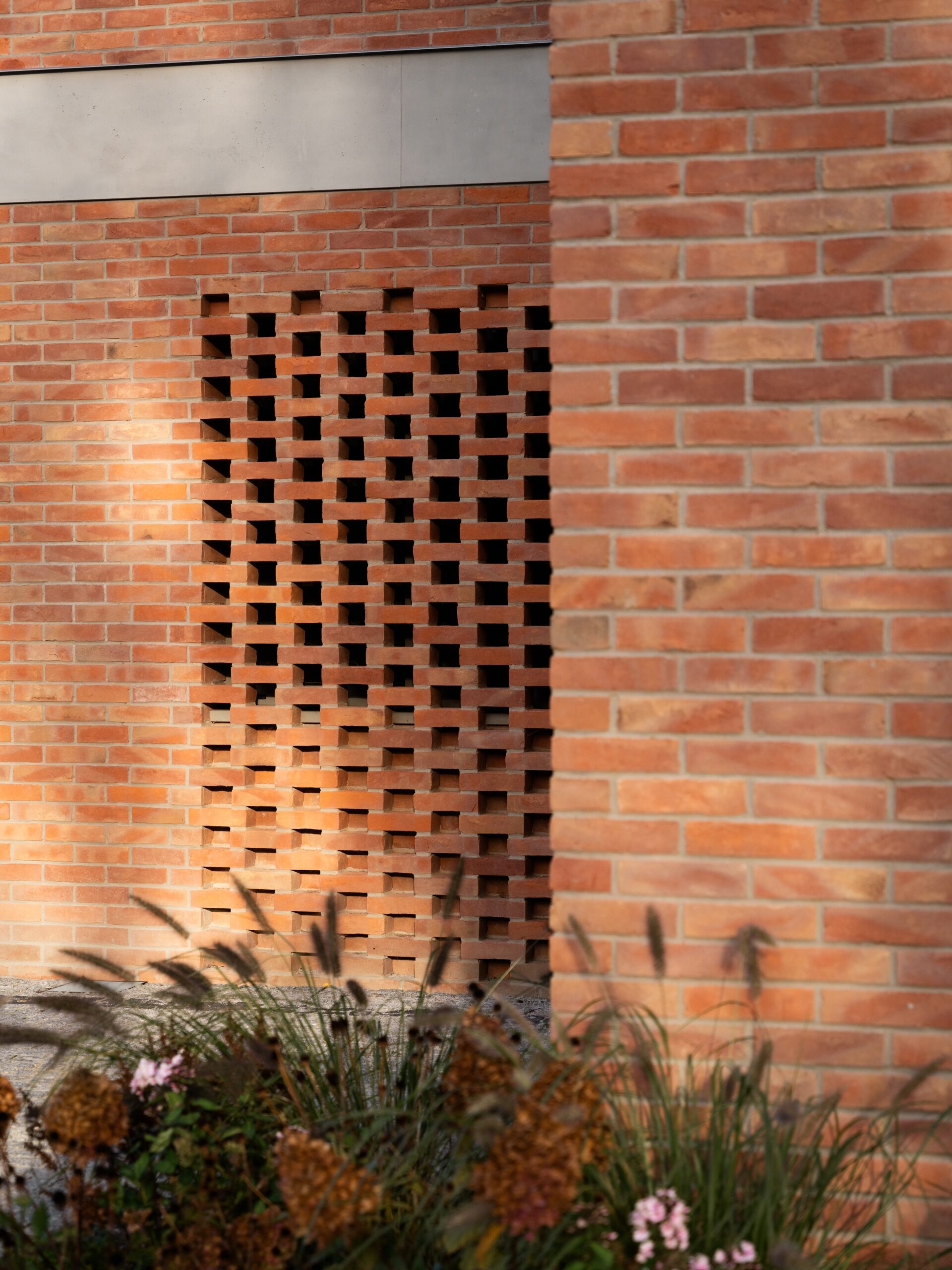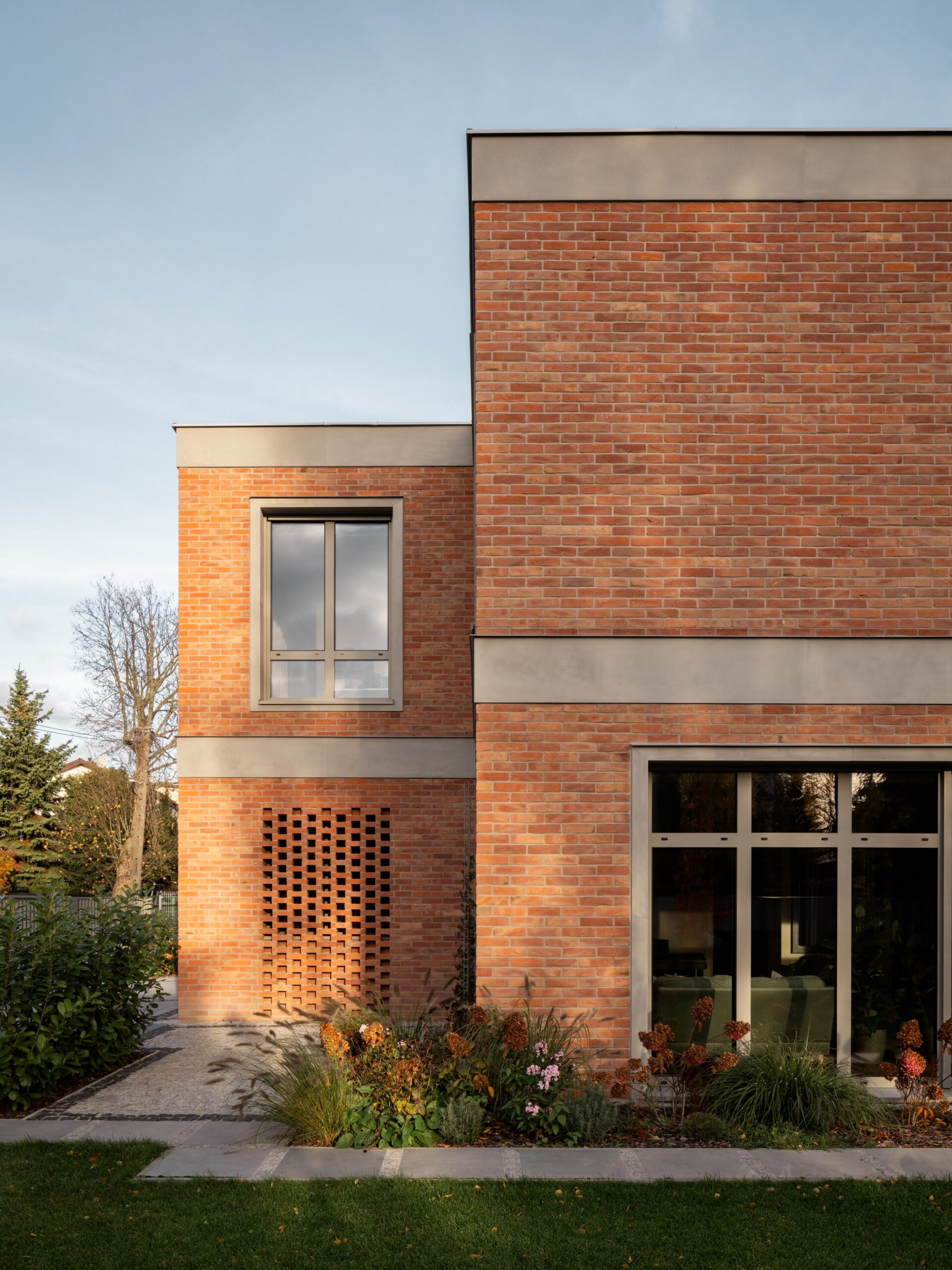 The building’s volume is defined by simple, horizontal divisions and clear geometry. The raw character of the form is softened by the brick façade, which adds warmth and a timeless quality to the architecture. The facing brick, in its natural and restrained tone, works harmoniously with concrete details and large glazed openings, creating a coherent and elegant composition.