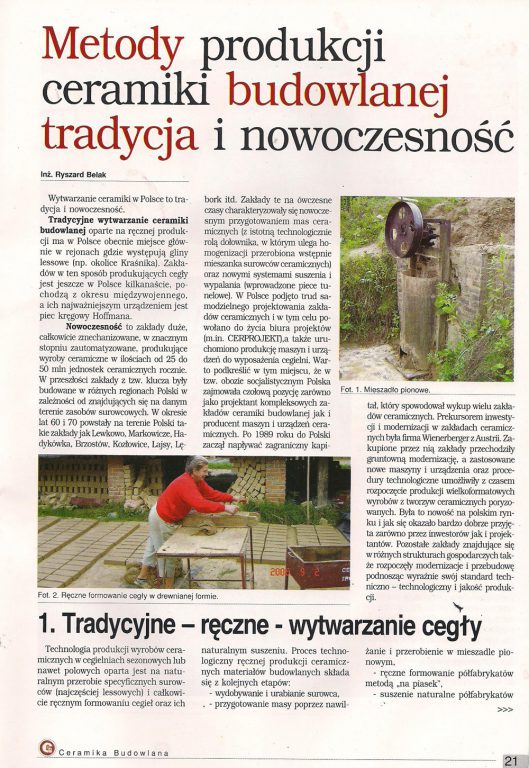 Modernity is betting big, completely mechanized, largely automated, producing ceramic products in amounts of from 25 to 50 million units per year of ceramic. In the past, the so-called factories. Key were built in different regions of the Polish depending located in the area of resources’ raw materials. During years 60 and 70 formed in the Polish businesses like Lewkowo, Markowicze, Ha-dykówka, Brzostów », Kozłowice, Łajsy, Lebork etc. These bets at that time were characterized by modern preparation of the ceramic material (with an important technological role dołounika in which is homogenized converted pre-mix of ceramic raw materials) and new systems of drying and firing (introduced tunnel ovens). In Poland, it is taken the trouble of designing your own ceramic works and for this purpose established the office projects (including CERPROJEKT), and started the production of machinery and equipment for brickworks equipment. It is worth noting at this point that the so-called. socialist camp Poland held the leading position both as a designer of complex building ceramics plants and machinery and equipment manufacturer of ceramic. After 1989, the Polish foreign capital began to flow, which caused the redemption of many ceramics plants. The precursor of investment and modernization in the ceramic plants was the company Wienerberger of Austria. Purchased by its plants underwent thorough modernization, and applied new machinery and equipment and technological procedures allowed the time to start the production of large-format products ceramic materials poryzowanych. It was a novelty on the Polish plaster and as it turned out very well received by both the Quaestors and designers. Other establishments in the different economic structures also started modernization and reconstruction of raising their standard clearly technical – technological and production quality.