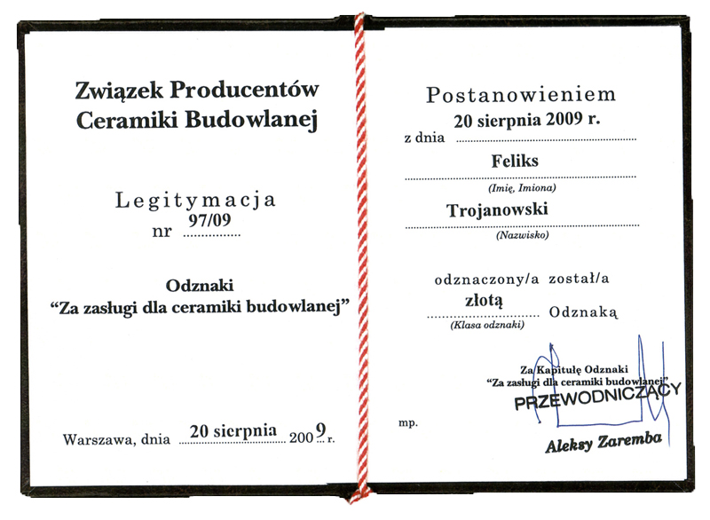 800 anniversary of Ceramics Building 7.10.2009r. Feliks Trojanowski awarded the Golden Badge of the Association of Manufacturers of Ceramics Polish.