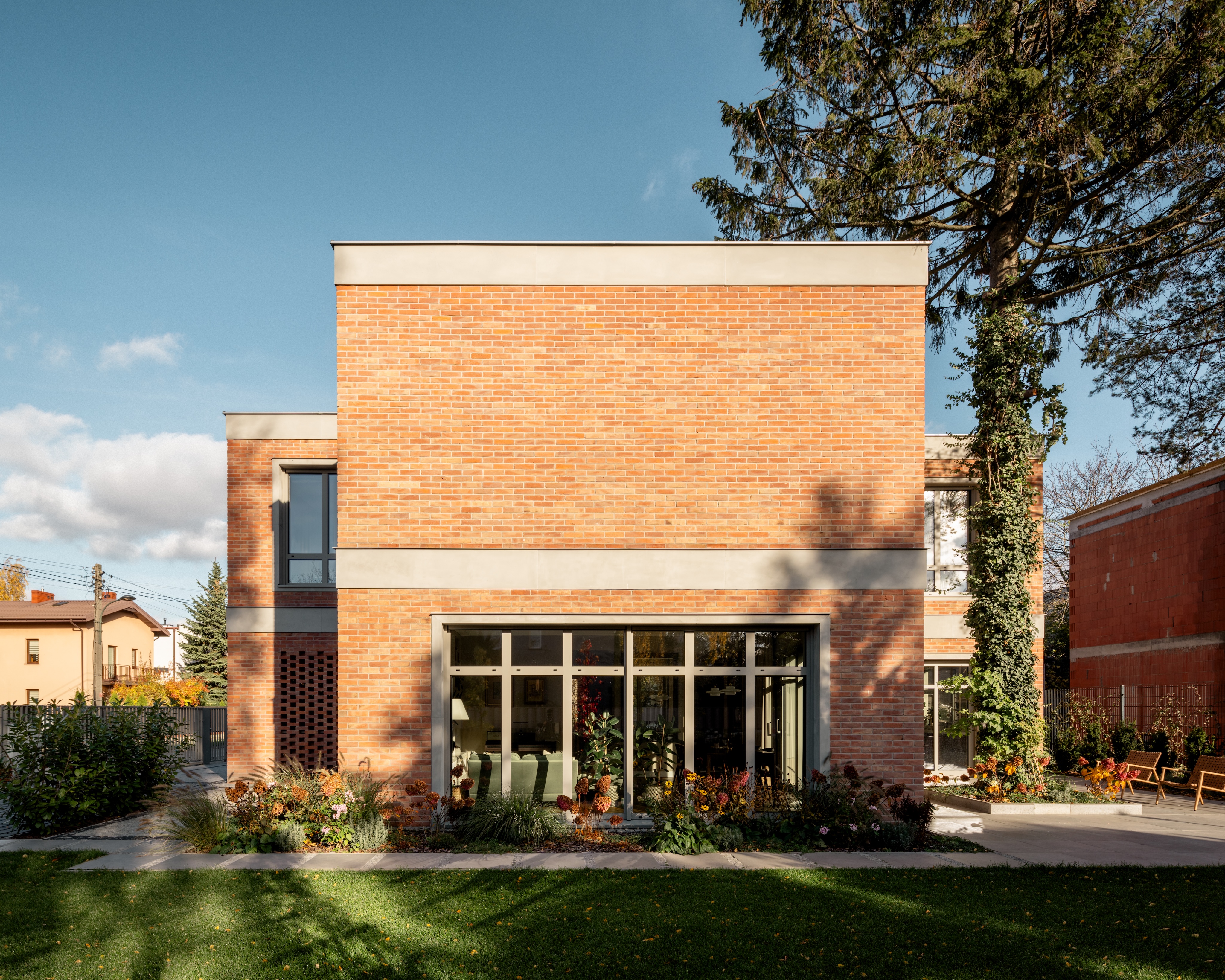 Bryła budynku opiera się na prostych, horyzontalnych podziałach i czytelnej geometrii. Surowość formy została przełamana przez elewację z cegły, która nadaje całości ciepła i ponadczasowego charakteru. Zastosowana cegła elewacyjna w naturalnym, stonowanym odcieniu doskonale współgra z betonowymi detalami oraz dużymi przeszkleniami, tworząc spójną i elegancką kompozycję.